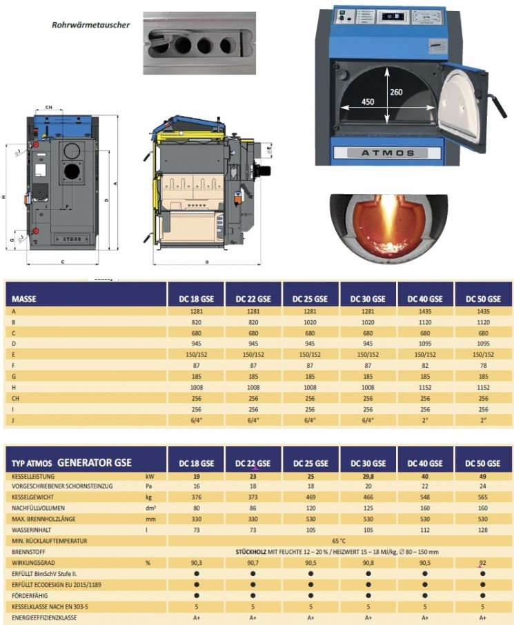 Die GSE Serie von ATMOS steht mit an der Spitze der Holzheizkesseltechnologie in Deutschland, bekannt für ihre Effizienz und weite Verbreitung. Mit sechs Modellen, die Leistungen von 19 bis 49 kW abdecken, bietet die Serie eine breite Auswahl für unterschiedliche Bedürfnisse. Die kleineren Modelle DC18GSE und DC22GSE sind für 38 cm lange Scheithölzer konzipiert, während die größeren Modelle DC25GSE bis DC50GSE Holzstücke bis zu 58 cm Länge aufnehmen können.