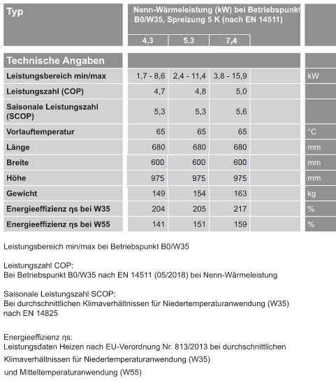 - Leistungszahl COP bei Betriebspunkt B0/W35 nach EN 14511 (05/2018) bei Nenn-Wärmeleistung